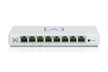 El S8‑PoE es un switch compacto con ocho puertos 10/100/1000, cuatro de los cuales admiten PoE+. Se puede colocar en un escritorio o en una pared. Todos los switch de Alta Labs incluyen la funcionalidad Bluetooth para una configuración sencilla del dispositivo.